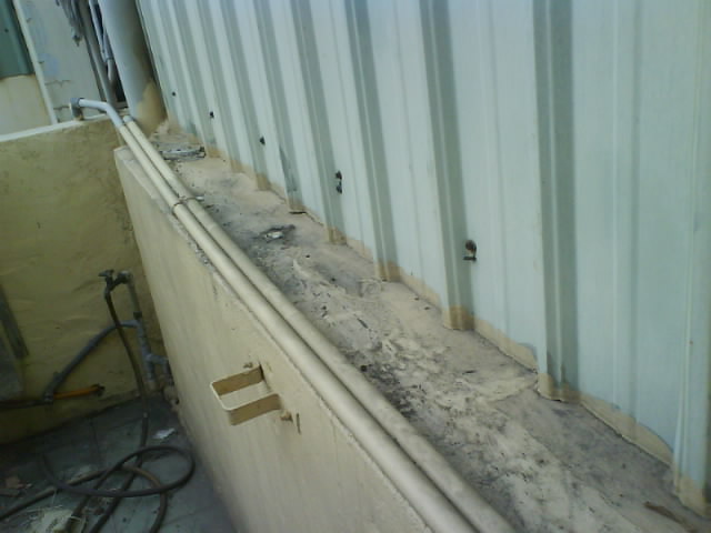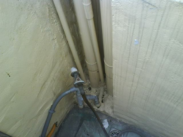 外墻│墻壁防水抓漏工程 ~~上圖中這么多管路的下方是漏水處,它的漏水源大致應該是在這里沒有錯, 水是從哪里滲漏說真的沒有一個人可以確實地告訴你, 在施工上我們要以全面性防水施作的心態(tài), 可以防止水無孔不入的特性.