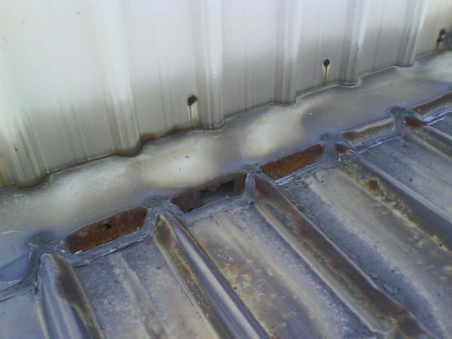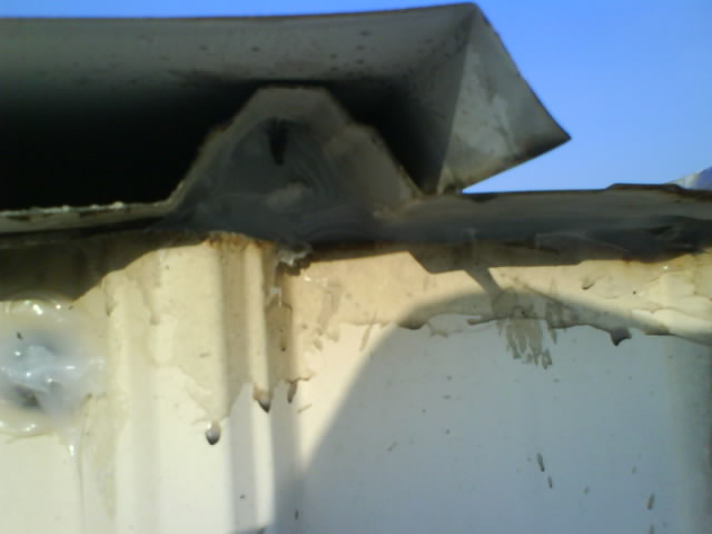 高雄抓漏-鐵皮屋漏水修繕 因凸出的部位擋住泄水溝,造成一下雨就會積水無法流出,時間久了導致鐵皮屋銹蝕,而造成漏水.原因為:鐵工施工不慎.首先應觀察別處是否還有漏水的可能性,將漏水施工處做全面性處理,以防止水的無孔不入的特性
