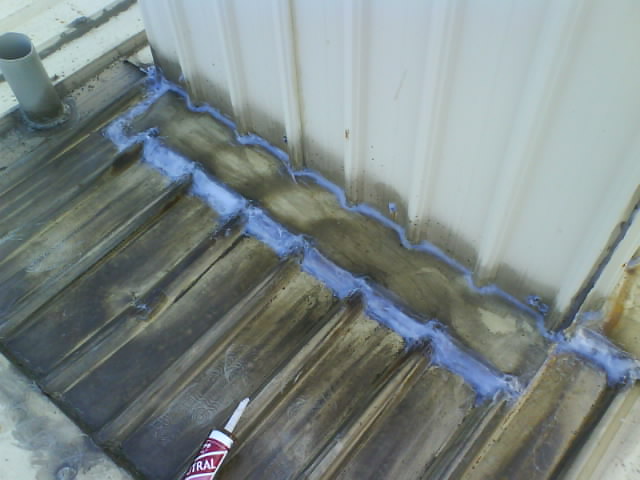 高雄抓漏-鐵皮屋漏水修繕 在積水的部位做上三度防水層,讓積水的位置可以裝水而不會滲漏水,釘頭和烤漆浪板搭接縫也可能是漏水的因素.用速利康(填縫材)全部補修.風也是影響漏水的原因,可將雨水以不同的角度吹入縫隙,而造成漏水.