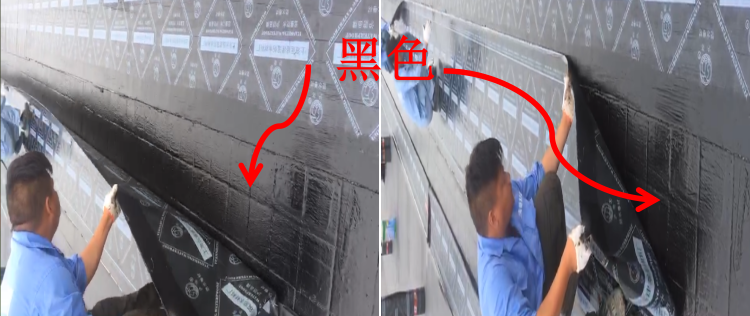 貼必粘在基面上剛開始涂刷時呈黃棕色,氣溫高時5-15分鐘即變成黑色(氣溫低時要30-45分鐘),此時用手指去輕按黑色涂膜,手感有粘性但不會粘附于手指上,此時即可將卷材于基面進行粘貼(如圖)。